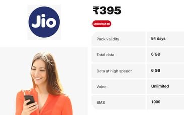 Jio के 395 रुपये वाले प्लान में यूजर्स को 84 दिनों की वैलिडिटी मिलती है, जो किसी अन्य प्लान के मुकाबले काफी ज्यादा है. साथ ही इस प्लान में कुल 6 जीबी हाई स्पीड डेटा दिया जाता है. इस प्लान की एक और खास बात यह है कि इसमें 5 जी अनलिमिटेड डेटा भी मिलता है. मतलब अगर आपके पास 5 जी हैंटसेट है, तो आप इस प्लान से अपने फोन का रिचार्ज करा सकते हैं. इस प्लान में 84 दिनों के लिए अनलिमिटेड कॉलिंग की सुविधा मिलती है. इसके साथ ही कुल 1000 SMS भी मिलते हैं. Jio के 395 रुपये वाले प्लान में यूजर्स को Jio के ओटीटी ऐप्स का भी फ्री सब्सक्रिप्शन मिलता है, जिसमें Jio TV, JioCinema, JioSecurity और JioCloud शामिल हैं.