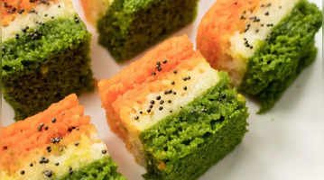 4) तिरंगा ढोकला: स्नैक्स के लिए ढोकला एक बढ़िया फूड डिश है। ये टेस्टी होने के साथ हेल्दी भी होती है। तिरंगा ढोकला बनाने के लिए सूजी, बेसन, टमाटर, दही, करी पत्ता, नारियल बूटा आदि सामग्रियों की जरूरत लगती है। इसके लिए केसरिया, सफेद, हरे रंग में बैटर तैयार किया जाता है। बैटर बनने के बाद पहले हरे रंग का बैटर, फिर सफेद और फिर केसरिया रंग का बैटर डालकर उन्हें स्टीम किया जाता है। इस तरह टेस्टी तिरंगा ढोकला तैयार होता है।