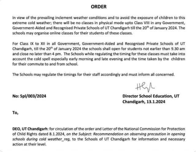 चंडीगढ़ स्कूल शिक्षा के निदेशक एचपीएस बराड़ द्वारा जारी नोटिस में कहा गया है कि मौजूदा खराब मौसम की स्थिति को ध्यान में रखते हुए और बच्चों को इतनी ज्यादा ठंड के मौसम के संपर्क में आने से बचाने के लिए चंडीगढ़ के किसी भी सरकारी, सरकारी सहायता प्राप्त और मान्यता प्राप्त प्राइवेट स्कूलों में 20 जनवरी तक 8वीं कक्षा तक की कक्षाओं के लिए फिजिकल मोड में कोई कक्षाएं नहीं होंगी. स्कूल ऑनलाइन कक्षाएं आयोजित कर सकते हैं.