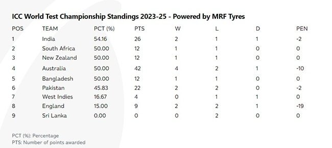 भारत का जीत प्रतिशत 54.16 का हो गया है, जो सबसे ज़्यादा है. बता दें कि भारत को पहले टेस्ट में स्लो ओवर रेट के लिए जुर्माना भी लगा था लेकिन दूसरे टेस्ट में शानदार परफॉर्मेंस कर भारत ने इसकी भरपाई कर ली है और इस समय अब टॉप पर पहुंच गया है.